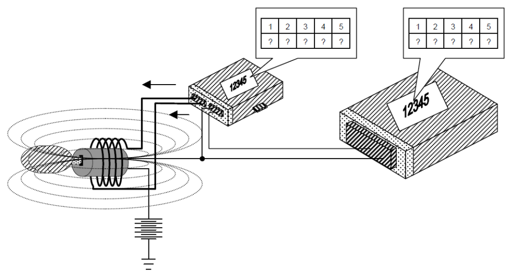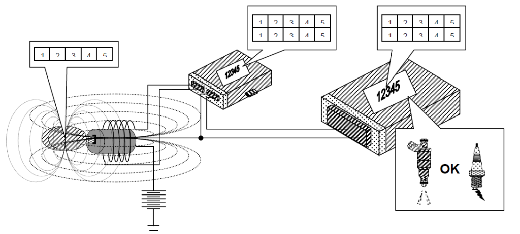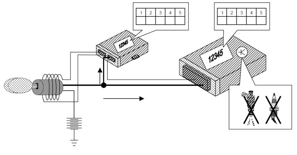 Este, por sua vez, energiza a bobina (antena) que se encontra instalada próxima (geralmente na volta) do cilindro de ignição. Quando a corrente elétrica circula pela bobina, a mesma cria um campo magnético, que por sua vez alimenta o Transponder (instalado dentro do punho da chave de ignição);